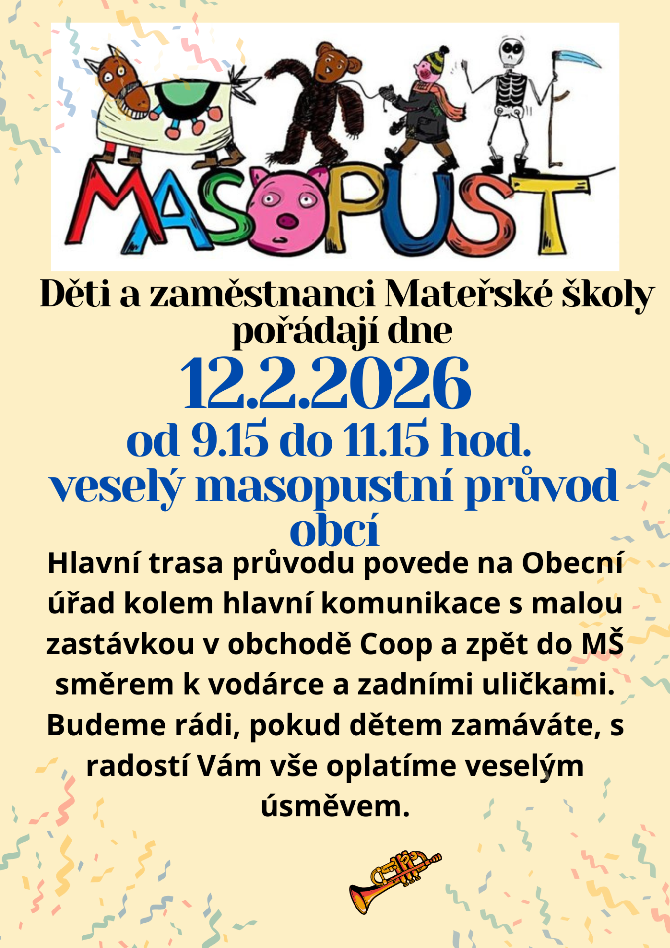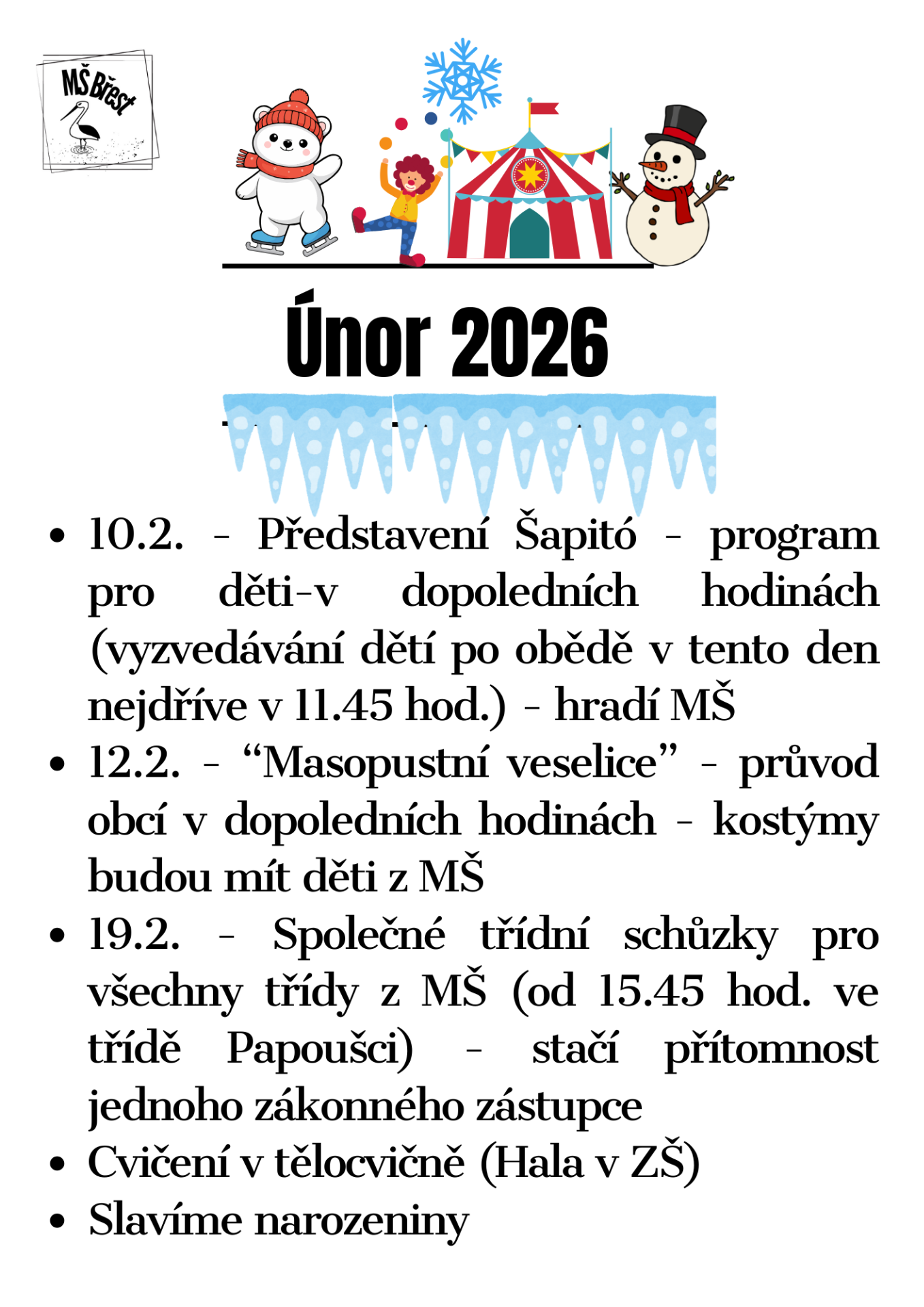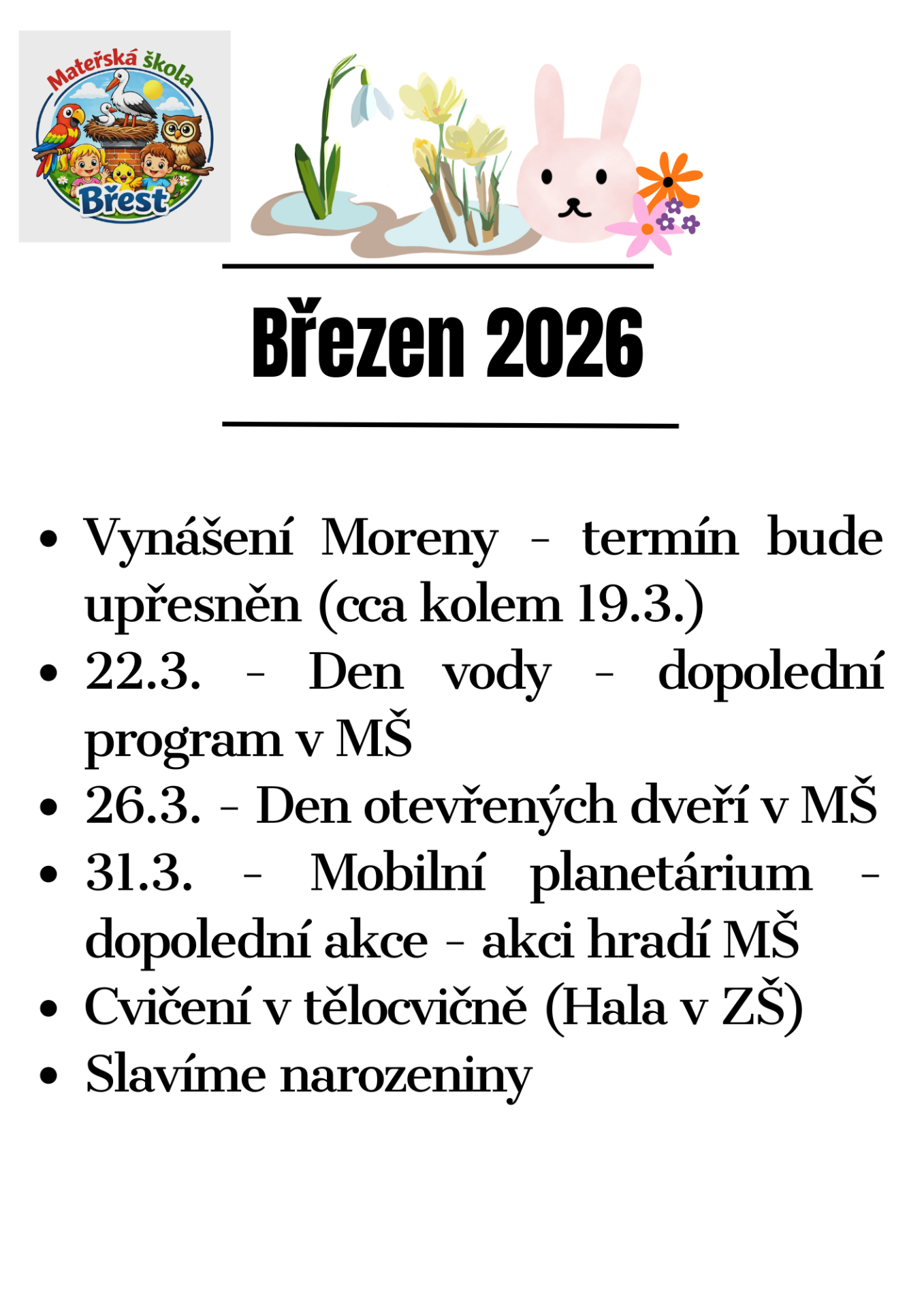 9.2.2026 - Tělocvična - připravte dětem do batůžku přezůvky a pití, děkujeme