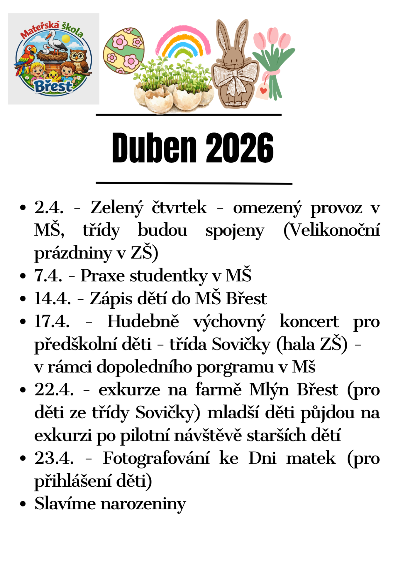 23.4. - v dopoledních hodinách proběhne jarní fotografování dětí ke svátku maminek (pouze pro přihlášené děti), prosíme, přihlašujte se u vstupní nástěnky v MŠ na přiložený seznam. Děkujeme