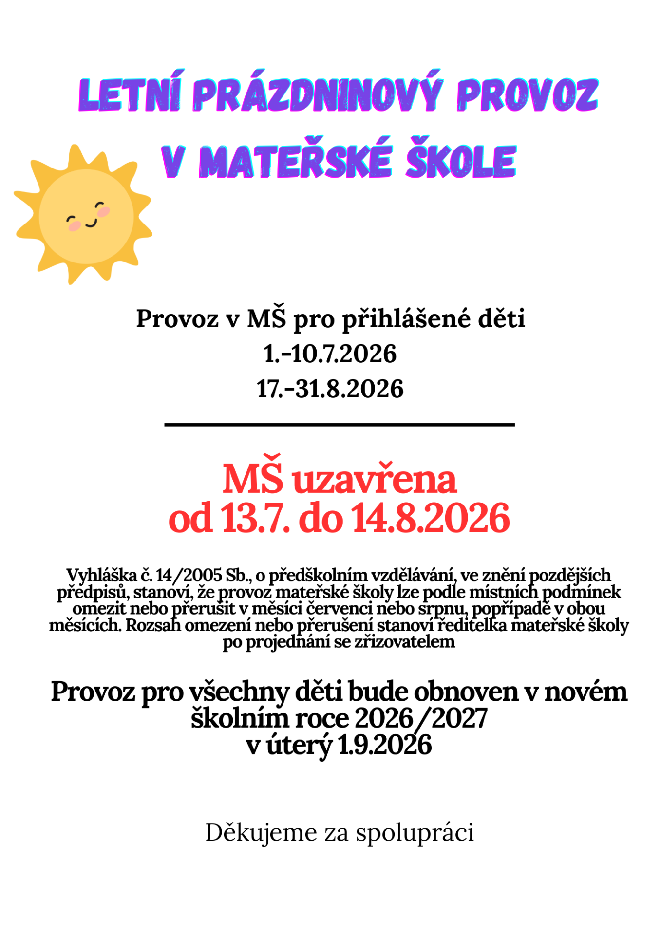 Provoz MŠ v srpnu 2025 - od 18.8.2025 - využívejte prozatím zadního vchodu ze zahrady, jak jste byli zvyklí během školního roku. V případě změny využívání předního vchodu budete ihned informováni. Nové šatny jsou již v provozu, projdete chodbou v přízemí. Děti budou posledních 14 dní v srpnu spojené ve třídě Papoušci v přízemí. Všechny potřebné informace najdete na nástěnce u zadního vstupu. Skříňky dětí budou využívány v tuto dobu pouze v jedné šatně. Děkujeme za pochopení.
